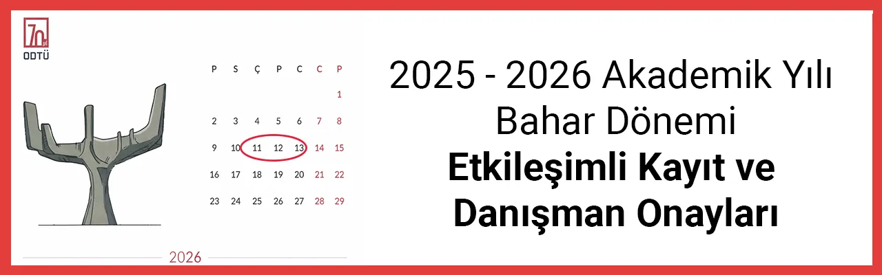 ODTÜ Duyuruları 2025-2026 Bahar Dönemi için Çift Anadal/Yandal Sonuçları Sevgili Öğrencilerimiz, 2025-2026 Bahar Dönemi için Çift Anadal/Yandal Başvuru sonuçlarına https://application.metu.edu.tr adresindeki Çift Anadal/Yandal Programları Başvurusu (Program… 10/02/2026 2025 - 2026 Akademik Yılı Bahar Dönemi Etkileşimli Kayıt ve Danışman Onayları Sevgili Öğrencilerimiz, 2025-2026 Akademik Yılı Bahar Dönemi ders kayıt sistem üzerinden çevrim içi (online) ortamda yapılacaktır. Bu doğrultuda, etkileşimli kayıt arayüzüne “Request… 06/02/2026 2024 -2025 BAHAR DÖNEMİ SONUNDA AZAMİ EĞİTİM ÖĞRETİM SÜRESİ DOLAN LİSANS ÖĞRENCİLERİNİN İKİNCİ EK SINAVLARI HAKKINDA DUYURU 2547 sayılı Kanun’un 44 (c) maddesi kapsamında azami eğitim öğretim süresi dolan Lisans öğrencileri ile ilgili Orta Doğu Teknik Üniversitesi Senatosu’nun belirlediği Uygulama Usul ve Esasları… 06/02/2026 tümünü gör ODTÜ Dışı There is no content in this category. tümünü gör Hızlı Bağlantılar Akademik Takvim Yönetmelikler Akademik Katalog Öğrenci İşleri Bilgi Sistemi YÖKSİS Bilgi Güncelleme ÖİDB Tarafından Sağlanan Hizmetler İlmi Hüviyet Tespiti İş Olanakları Hakkımızda Misyon - Vizyon Kalite Politikamız Faaliyetlerimiz Faaliyet Raporlarımız ISO-9001:2015-Kalite Yönetim Sistemi Information Security Policy Bilgi Güvenliği Politikası Dilek ve Öneri Değerlendirme Politikası Organizasyon Şeması Tarihçe Personel İletişim