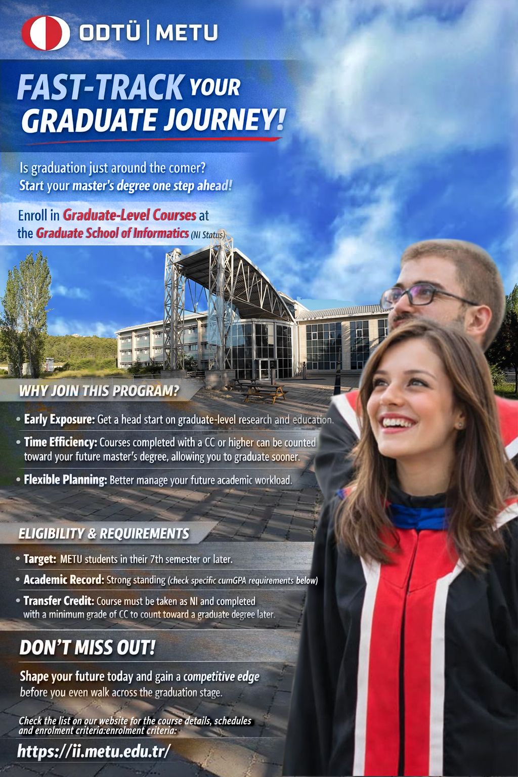 Enformatik Enstitüsünün lisansüstü süreçler ile ilgili duyurusu aşağıda paylaşılmıştır. Detaylı bilgi için https://ii.metu.edu.tr/tr/duyuru/fast-track-your-graduate-journey adresini ziyaret edebilirsiniz.