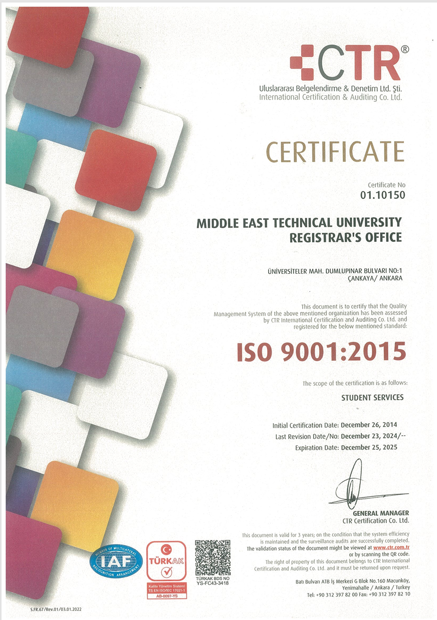 METU Registrar's Office has been qualified to obtain ISO 9001:2008 Quality Management System Certificate on December 27, 2013, and ISO 9001:2015 Quality Management System Certificate on December 20, 2017.
